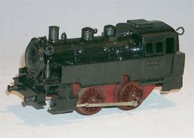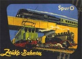 Zeuke 3-Schienensystem mit drei isolierten Schienen: Links die Zeuke T55 C-Tenderlokomotive, rechts die BR 64 1'C1'-Tenderlokomotive (die Schleifer für die mittlere Schiene fehlen). Zeuke stellte auch ein breites Sortiment von rollendem Material in Tinplate-Technik her, mit ganzflächigen Schiebebildern zur Beschriftung und Darstellung zusätzlicher Details, wie der Holztäfelung von Güterwagen. Die Kupplungen waren automatisch, aber meines Erachtens viel funktioneller und ansehnlicher als die Hornby-Version. Das Eisenbahn-Zubehör schloß Licht- und Formsignale mit Schaltgleisen ein, eine prächtige Signalbrücke, ein elektromagnetisches Entkupplungsgleis und Bahnübergänge. Eisenbahngebäude waren aus gipsüberzogenem und bemaltem Holz gefertigt. 1955 kaufte Zeuke & Wegwerth die gesamte Spur 0-Produktion der Firma Stadtilm auf und setzte die Produktion von Teilen des Sortiments fort einschließlich der BR 64 1'C1'-Tenderlok. Alle Züge waren gemarkt "Zeuke-Bahnen, Elektro-mechanische Qualitätsspielwaren". Die Zeuke 3-Schienen-Lokomotiven, die ich kenne, sind: