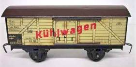 Zeuke Kühlwagen. Modell-Sortiment links mit Puffern und Automatik-Kupplungen, Spielzeugeisenbahn-Sortiment rechts ohne Puffer und nur mit Hakenkupplungen. |