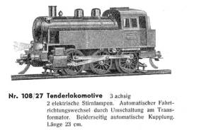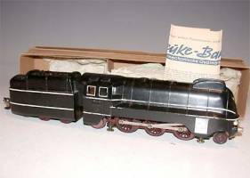Die Firma wurde im Ostteil von Berlin kurz vor Ende des II. Weltkriegs gegründet. Nach dem Krieg schloß sich Werner Zeuke mit Helmut Wegwerth zur Zeuke & Wegwerth KG (KG = Kommanditgesellschaft) zusammen. Als die sowjetische Administration die Wiederaufnahme der Spielzeugproduktion anordnete, begann Zeuke 1946 mit der 2'C-Lokomotive 'FD 50'. Das war aus verschiedenen Gründen bemerkenswert: es war ein Modell der berühmten 'Borsig'-Stromliniendampflok, mit einem Bakelit-Gehäuse und Metallguß-Rädern. Ausgelegt für elektrischen Dreischienenbetrieb hatte sie einen 24V Wechselstrom-Motor und einen Handschalter für die Fahrtrichtungsänderung. Die FD 50 zeigt, daß nach dem Krieg die Idee von Modelleisenbahnen schon so stark war, daß Zeuke von Beginn an versuchte, realistische Modelle zu kreieren. Bakelit wurde das bevorzugte Material für Lokomotiven und Schnellzugwagen, da es mehr Details erlaubte als die traditionellen Tinplates. Zeuke bahnte dann einem einzigartigen 3-Schienen-Wechselstromsystem den Weg, entwickelt, um zuverlässig das Problem der Fern-Fahrtrichtungsumschaltung zu lösen. Anstatt nur der mittleren Schiene wurden alle drei isoliert, weshalb alle Fahrzeuge isolierte Räder aus Phenoplast haben mußten. Die Lokomotiven hatten zwei gefederte Pilzschleifer für jede Sciene, sechs insgesamt. Die zentrale Schiene bildete immer die Erde, während eine der äußeren Schienen zum Antrieb des speziellen 24V-Wechselstrom-Motors bestimmt war, der eine geteilte Feldwicklung besaß, eine Hälfte für vorwärts, die andere für rückwärts. Spätere Modelle wie die C T55 verfügten über 18V-Motoren. Damit fand Zeuke eine elegante und absolut verläßliche Lösung für die Fern-Fahrtrichtungsumschaltung, frei von den früher allgemeinen Problem der unerwünschten Umschaltung, falls der Strom zufällig unterbrochen wurde, z.B. beim Überfahren von Schienenstößen. [Udo Becher, Werner Reiche, "Bodenläufer, Spielbahn, Supermodell", Leipzig 1981, pp. 168]. Der einzige Nachteil war ein ästhetischer: die Phenoplast-Räder waren eher von einem traurigen Braun, das ist besonders unglücklich, wenn man es mit dem leuchtenden Rot von heutigen Bahnen vergleicht. |